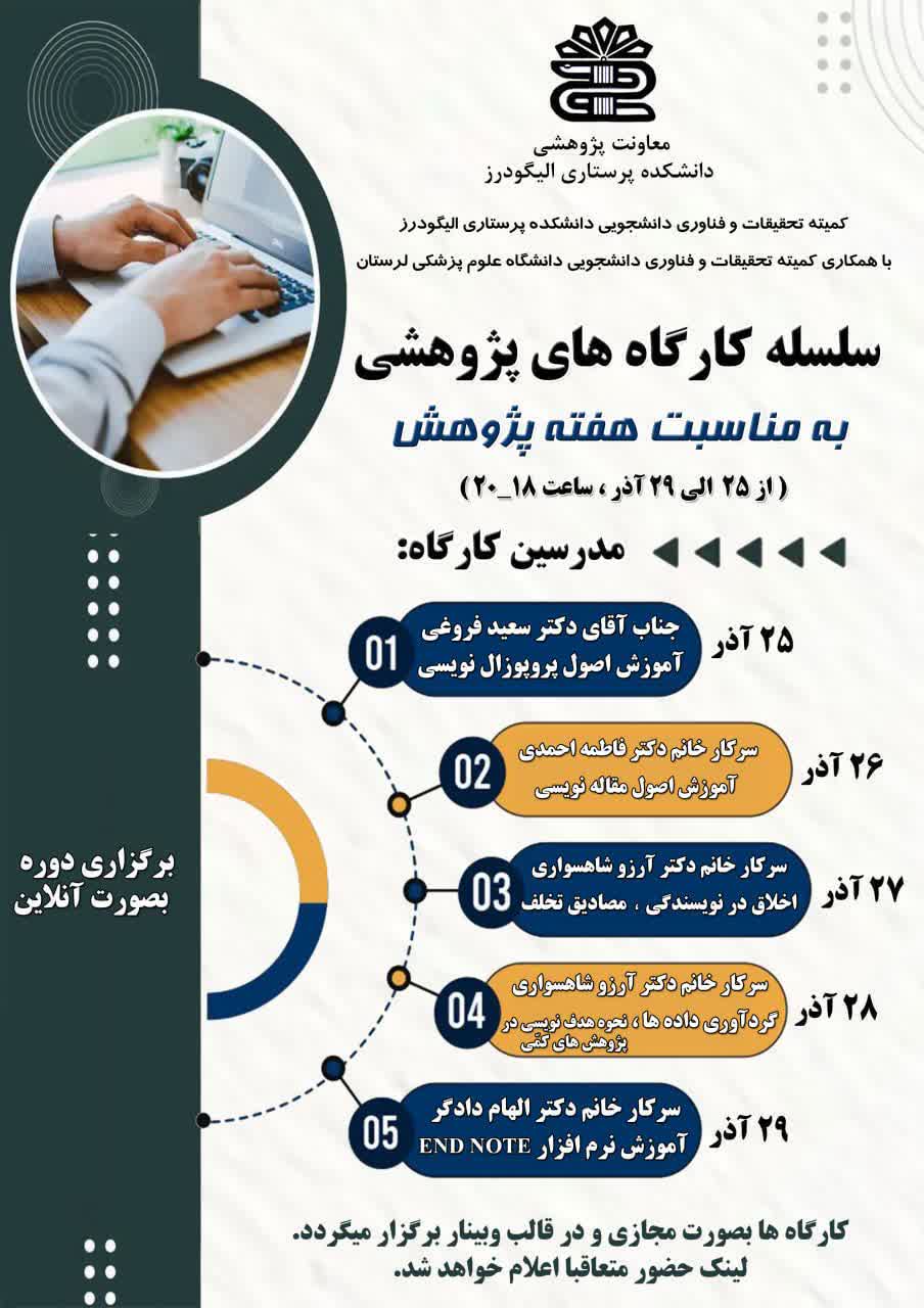 به مناسبت هفته پژوهش و به همت واحد پژوهش و کمیته تحقیقات و فناوری دانشجویی دانشکده سلسله کارگاههای پژوهشی از 25 لغایت 29 آذرماه بشرح ذیل در بستر اسکایروم برگزار گردید.